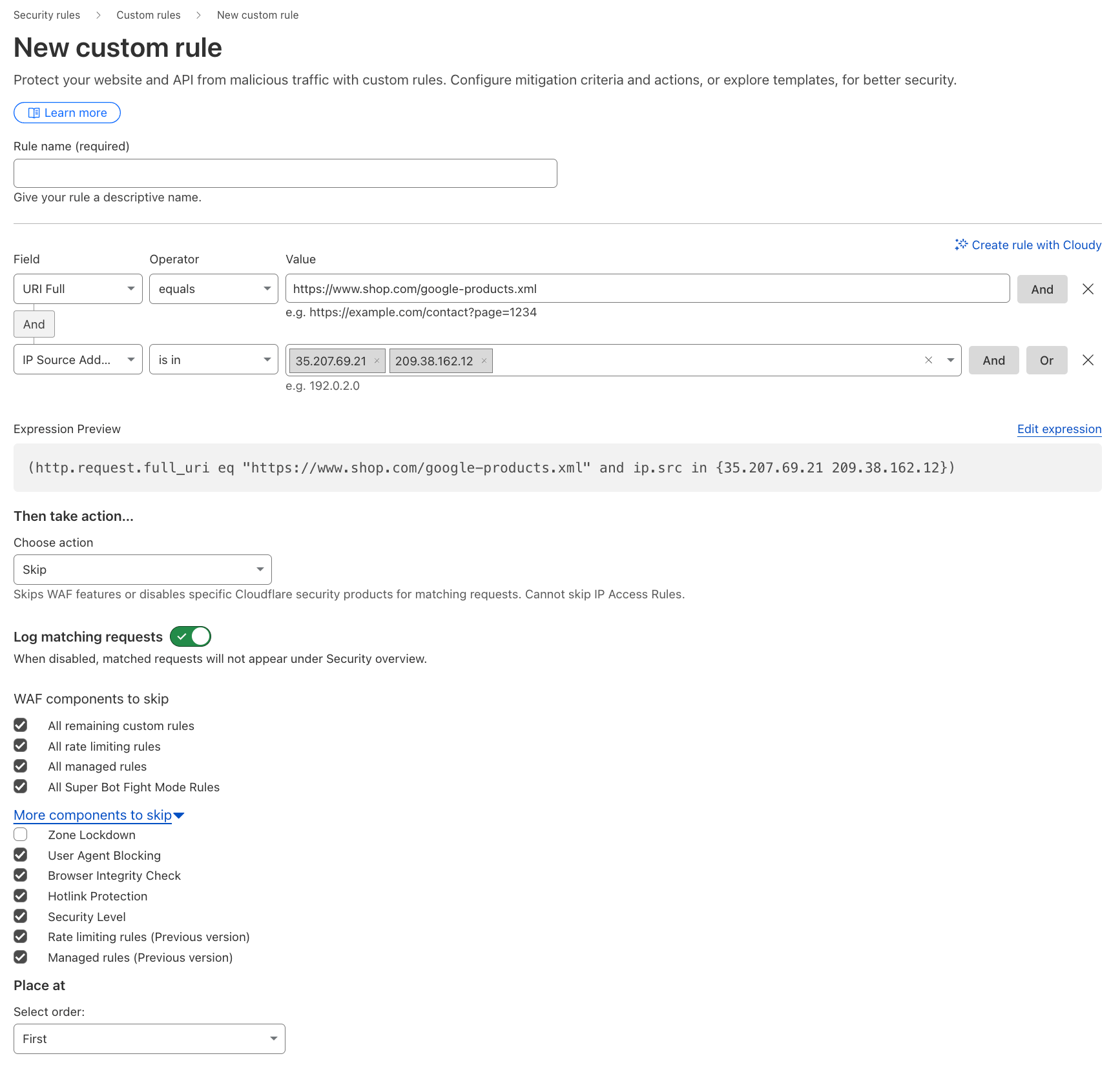 (http.request.full_uri eq "https://www.shop.com/google-products.xml" and ip.src in {35.207.69.21 209.38.162.12}) - Select the “skip” action and skip ALL components